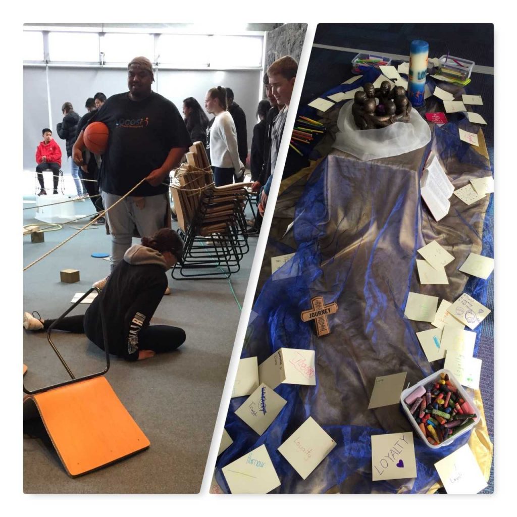 One of the main activities was an obstacle course in the chapel. The chairs were scattered everywhere and one person in our group was blind folded and had to get the lollies which were hidden in cones and under chairs. The group had to guide this person, who wasn’t allowed to touch anything but the lollies. And if they did touch a chair or a cone or a rope, all our lollies which we had collected were scattered back into the obstacle course.